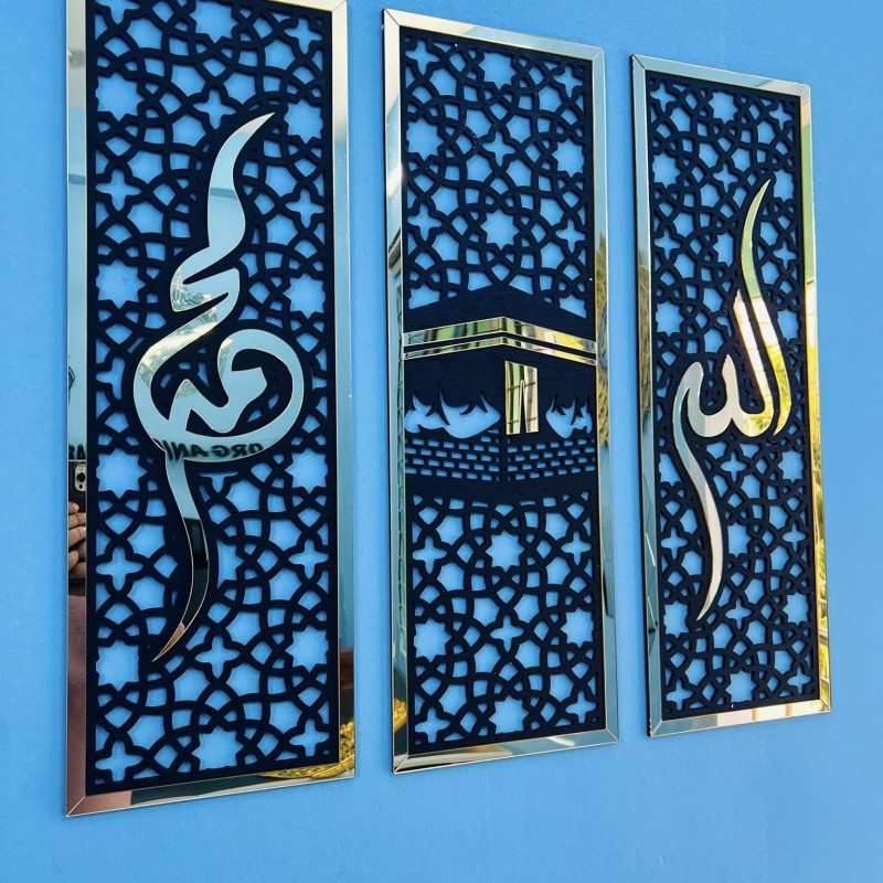 3-Piece Luxury Islamic Mirror Set – Kaaba – Allah Calligraphy in Golden Mirror Acrylic