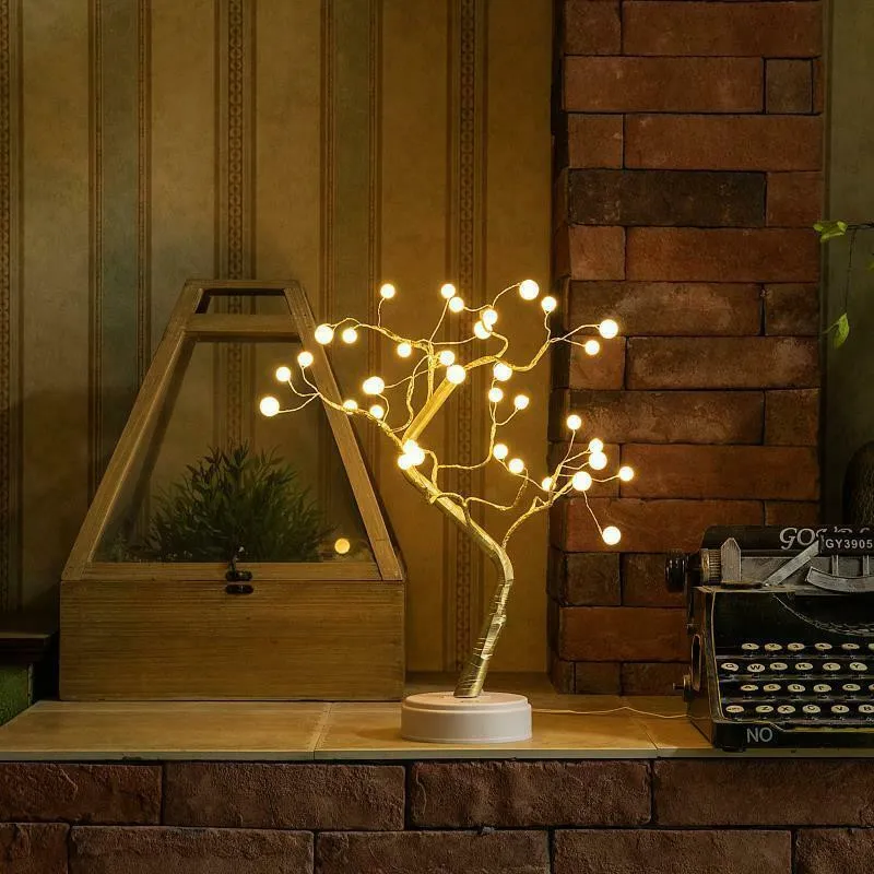 Description: Product introduction: 36 heads – pearl tree light / 108 heads – copper tree light. Product size: base 12cm. 36 heads – the height of the pearl tree is about 45cm, 108 heads – the height of the copper tree tree is about 50cm, and the base switch is touch type, which is more high-end atmosphere. Power supply: no. 5 battery box (bottom), USB power supply is also available, free choice. Package include: 1*lamp holder 1*lamp body