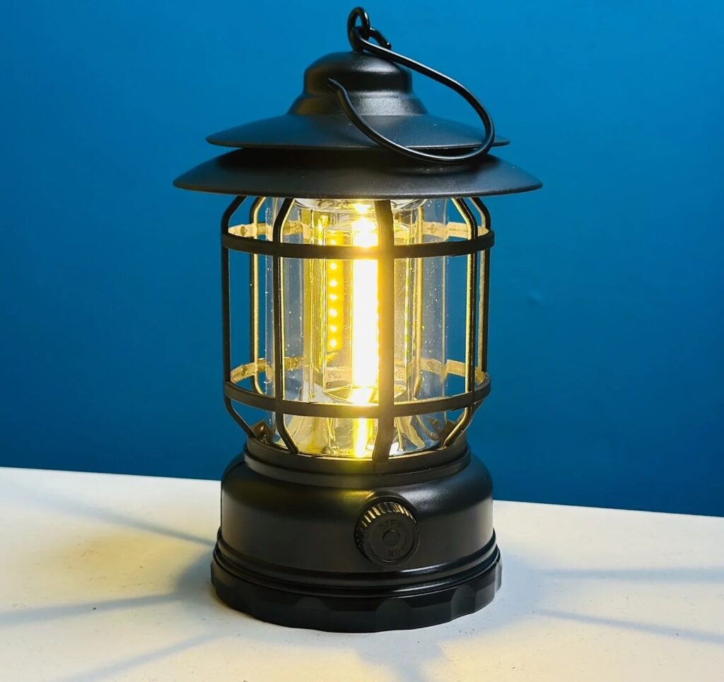 Lightweight and compact, the lamp features a built-in hook — hang it from a tent, branch, or pole for hands-free lighting.